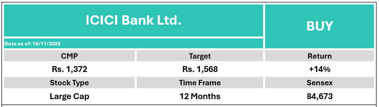 ICICI Bank delivered a satisfactory performance in Q2FY26 supported by healthy loan growth and resilient margin, amid a competitive environment. The bank highlighted continued traction across retail and business banking segments. Asset quality was stable, with prudent provisioning and strong capital buffers ensuring balance-sheet resilience. Its strategic focus on risk-calibrated profitable growth positions the bank for long-term scalability. Stable asset quality, better unsecured cohort and smother regulatory transitions are expected to strengthen future performance. Hence, we upgrade our rating on stock from HOLD to BUY, based on sum-of-the-parts (SOTP) valuation, with a revised target price of Rs 1,568.